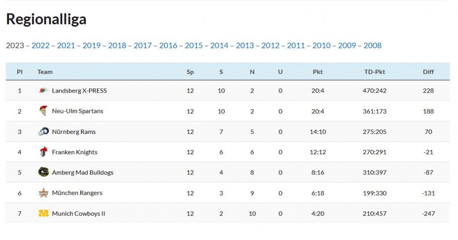 Tatsächlich haben sich die Spartans auch im Power-Ranking des online-Fachportals "Football Aktuell" inzwischen auf Rang 37 unter allen Teams in Deutschland vorgearbeitet. Und auch die Abschluss-Tabelle gibt einigen Aufschluss, weist zum Beispiel die Qualität der Defense aus und gibt den Fingerzeig: Die Offense muss sich noch entwickeln. Es wurden im Durchschnitt nur wenige gegnerische Scores zugelassen, aber die Offense hat dann doch manchmal vergleichsweise mäßig gepunktet - beispielweise im unerwartet mit 10:11 so knapp verlorenen Heim-Spiel (!) gegen die Rams, was letztlich die Meisterschaft kostete.