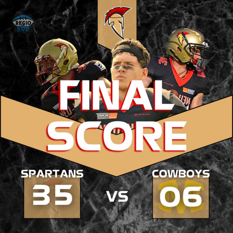 So kam es, dass die hart kämpfenden Gäste der Munich Cowboys 2 zu Beginn des 4. Viertels sogar kurz vor der ersten Führung standen. Nur wenige Meter vor der Spartans-Endzone konnte die Abwehr einen vierten Versuch stoppen, indem sie einen Fumble eroberte. Das war dann allerdings der benötigte Weckruf. In der folgenden Angriffsserie stürmte Quarterback #7 Hunter Sturgeon über 50 Yards mit einem fulminanten Lauf in die gegnerische Hälfte, kurz darauf vollendete Running Back #25 Yosley Povea mit einem Lauf-Touchdown. Die Defense eroberte den Ball dann durch zwei Interceptions durch #6 Nicolas Prinz und #56 Max Walser zurück, die Offense bedankte sich mit schönen Lauf-Touchdowns durch #30 Felix Klein. Ein besonderes Highlight setzte dann noch Cornerback #22 Joshua Bocksrocker, der einen improvisierten Punt der Gäste fing und über 30 Yards bis fast in die Endzone trug. Den letzten Meter und auch Schlusspunkt zum 35:06 erzielte dann wieder #25 Yosley Povea. (alle 4 Extrapunkte sicher gekickt von Max Walser).