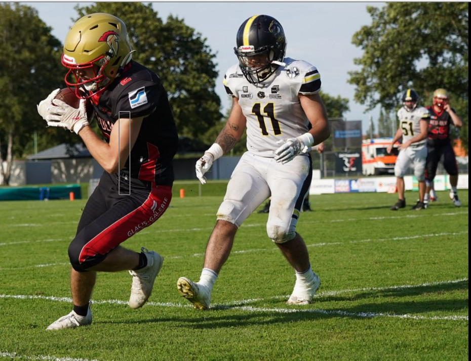 Gerade von den sechs aus der eigenen Jugend aufgerückten Talenten wollten sie sehen, ob dieser Nachwuchs reif für die Regionalliga ist. So waren in der Defense zeitweilig gleich vier 19-Jährige auf dem Platz. Zwar gelang es Amberg so, besser ins Spiel zu kommen und in Hälfte zwei 21 Punkte zu machen. Aber durch weitere Interceptions durch Max Walser und Alexander El Banna (#24) war der Sieg nie gefährdet.