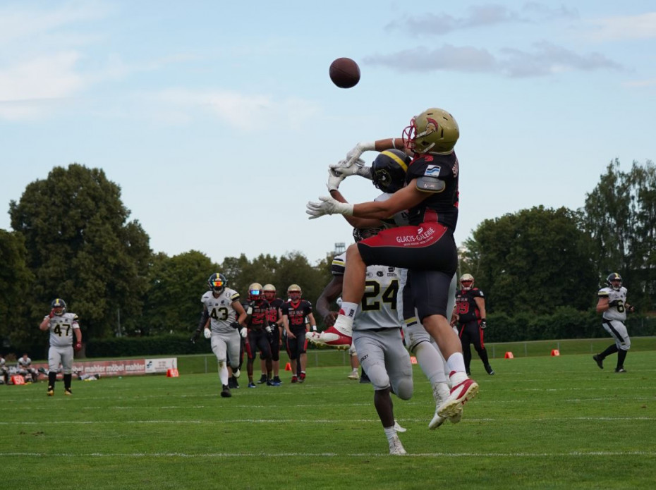 Die erste Anrgiffsserie in diesem letzten Heim-Match der Saison schloss Running Back Dirk Mainka (#34) mit einem 25-Yard-Lauf zum Touchdown ab. Den fälligen Zusatzpunkt (PAT) erkickte Max Walser (#56 ). Einen zweiten Offense-Touchdown später stand es dann schon 14:00, bevor Cormerback Elias Mauritius (#23) einen Pass von Gäste-Quarterback Joshua Mills abfing und direkt für 70 Yards in die Endzone trug.