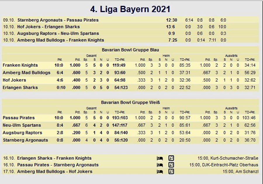 Dieses 9:0, gepaart mit den übrigen Ergebnissen, reicht nicht, um die Play-Offs aus eigener Kraft zu schaffen. Der direkte Konkurrent um den besten Zweiten aus der Gruppe „Blau“, die Amberg Mad Bulldogs, haben zwar am Wochenende gegen die Franken Knights mit 7:25 verloren, haben aber bei jetzt mit derselben Punktedifferenz von 30 Plus-Punkten wie die Spartans die besseren Aussichten. Gewinnen die Amberger am kommenden Wochenende ihr letztes noch offenes Spiel (gegen Hof Jokers), haben sie als Zweiter in der Abschluss-Tabelle ihrer Gruppe mit 8:4 dieselbe Punktzahl wie die Spartans in ihrer Gruppe. Die Spartans müssen also abwarten, ob die Hof Jokers ihnen Schützenhilfe leisten und die Mad Bulldogs besiegen. Dann würde Neu-Ulm die Playoffs erreichen und es ginge zum Habfinale nach Bayreuth zum Sieger der Gruppe „Silber“.