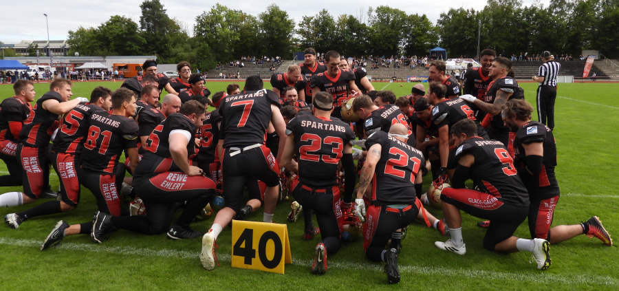 Die noch ungeschlagenen Gastgeber erwischten einen Start nach Maß: Direkt in der ersten Angriffsserie konnten sie einen ganz starken, langen Lauf hinlegen und wenige Spielzüge später den ersten Touchdown (TD) plus 2-Point-Conversion erzielen. Konnten die Spartans sich im ersten Viertel noch auf 08:07 herankämpfen - durch einen schönen Pass von Quarterback Hunter Sturgeon (#7) auf Patrick Schempf (#9), Extrapunkt (PAT): Tolga Kiremit (#57) – so legten die Rams im zweiten Quarter per TD und 2-Point Conversion nach. Zwei gute Chancen noch vor der Halbzeit konnten die Spartans nicht nutzen und gingen so mit 16:7 in die Halbzeit.