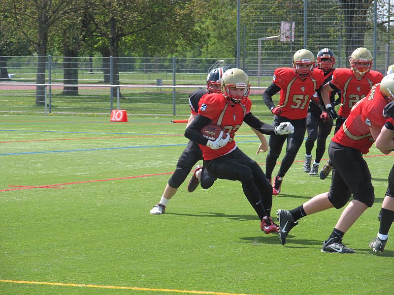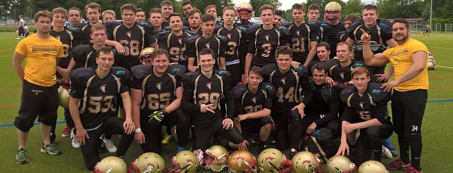 Der Ligastart war am 24. April auswärts gegen die Königsbrunn Ants. Hier profitierten die jungen Spartaner von ihrer langen intensiven Vorbereitung und konnten souverän mit 36:13 gewinnen. Es folgte das Rückspiel, welches ebenfalls mit 44:39 einen Sieg für die Spartans gab. Gegen den späteren Gruppensieger, die Franken Knights, mussten die Spartans am 13. Mai ihre erste Saisonniederlage mit 13:42 einstecken. Das war eine bittere Pille, bei der das Niveau der Liga auch dem Letzten bewusst wurde. Das Team schaffte es aber sich erneut zu konzentrieren und gewann das nächste Spiel gegen München mit 37:27. Es folgte der Angstgegner, die Allgäu Comets, bei denen die Spartans ihr härtestes Spiel der Liga absolvierten und neben einigen Verletzungen ein 7:31 Verlust einsteckten. Mit dieser Niederlage in den Knochen hat es auch im Rückspiel gegen München knapp nicht gereicht (7:12). Für die Zukunft nahm sich das Trainerteam vor, diese schwache Phase während Schulabschlüssen und Pfingstferien unbedingt besser hochzuhalten, um auch in dieser Zeit Ausfälle kompensieren zu können. Allerdings konnten im Heimspiel gegen die Allgäu Comets am Ende der Saison nochmals alle Kräfte mobilisiert werden. Das spannendste Spiel konnten die Spartans im vierten Viertel durch einige taktische Spielzüge und 2 Touchdowns mit 26:21 für sich entscheiden. Dieser schöne Saisonabschluss als Tabellendritter der Gruppe West mit einer ausgeglichenen Punktebilanz gibt Hoffnung für die kommenden Jahre.