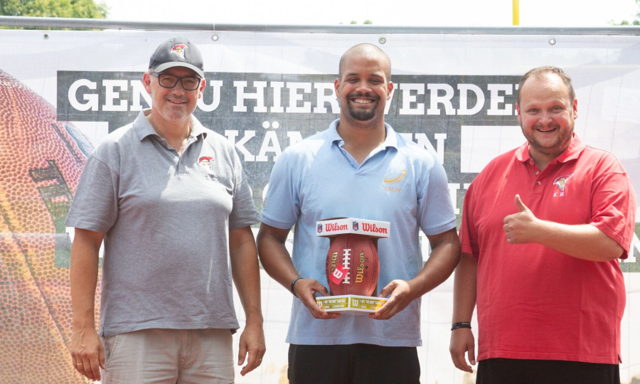 Auf dem Foto v.l. Thomas Böttinger 2. Vorsitzender Förderverein Neu-Ulm Spartans, Jermaine Wolff (Jermaine's Motivation & Workout Camp), Klaus Weiß, Abteilungsleiter Football im TSV 1880 Neu-Ulm.