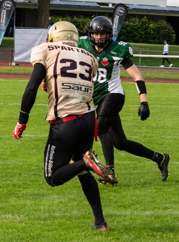 Wenn ein Team zu Null spielt, kann in der Defense nicht viel falsch gemacht worden sein. Und die Spartans-Defense war, extrem gut gecoacht von Marcus Fritz (auf dem Foto oben: rechts), gegen Traunreut nahezu fehlerlos. Es gab praktisch keine Strafe gegen die Defense, sie eroberte mehrfach das Angriffsrecht durch Interceptions und hielt einfach dicht. Hervortun konnten sich vor allem die Leitwölfe der D-Line Jermaine Wolff (#51) und Steffen Ganghof (#91). Wolff zwang den Gegner nahe dessen Endzone zum Fumble und Dennis Fazlagic (#54), ein weiterer Rookie, schnappte sich den Ball und verwandelte. So krönte der noch fehlende neunte Touchdown die Defense-Leistung. Bleibt lobend zu erwähnen: Ganghof war es auch, der nach allen neun Touchdowns durch präzise Kicks durch die Torstangen den jeweiligen Zusatzpunkt erzielte.