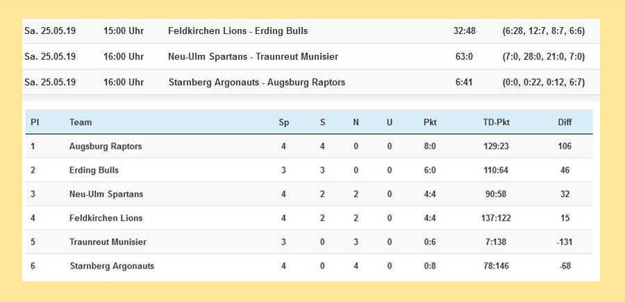 Der nächste Gegner ist Feldkirchen Lions, mit denen die Spartans nun den Tabellenplatz getauscht haben. Wegen des enorm verbesserten Scorer-Verhältnisses. Und dann kommen die Lions nach der Pfingstfest-Pause zum Rückspiel nach Neu-Ulm.