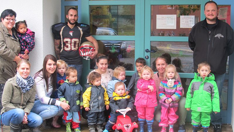 Einen besonderen Besuch erhielt die Kindertagesstätte St.Nikolaus in Neu-Ulm vergangene Woche. Klaus Weiß, Abteilungsleiter der Neu-Ulm Spartans, überraschte die Kleinen und hatte dabei noch ein kleines Geschenk dabei. Ein nagelneues Bobby Car für die KiTa.