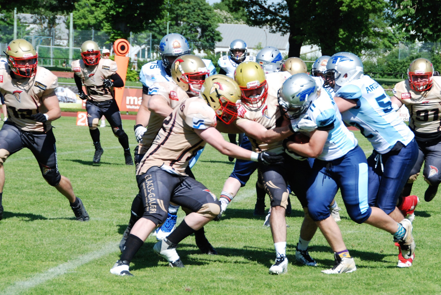 Zur Wahrheit dieses zweiten Saison-Matches gehört: Die Spartans traten mit einem Kader von 43 Athleten an, die Argonauts konnten nur die Mindestzahl von 22 Mann aufbieten, die für ein Meisterschafts-Spiel festgelegt ist. Mit noch frischen Kräften konnten sie im ersten Quarter noch mithalten; den Spartans gelang da nur ein Field Goal (FG). Bereits im zweiten Quarter konnte die Neu-Ulmer Offense um den neuen Quarterback (QB) Hunter Sturgeon (#7) zwei Touchdowns (TD) erzielen: einen per Lauf durch Running Back Dirk Mainka (#34), den zweiten durch Pass von Sturgeon auf Patrick Schempf (#9); für den jeweiligen Zusatzpunkt (PAT) beförderte Max Walser (#56) das Ei gewohnt sicher durch die Torstangen. Und die in der gesamten Begegnung hervorragend orientierte Defense steuerte per Safety zwei Punkte zum Halbzeitstand von 19:0 bei.