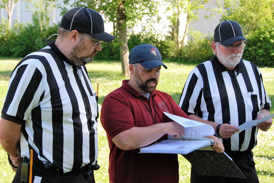 Spartans alter und neuer Head Coach Daniel Koch vor dem Match im Spielerbogen-Abgleich mit den refs.