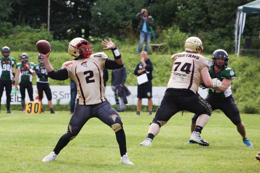 In der Offense der Spartans lief es in der ersten Hälfte mit Eddie Jewel (#2) als Quarterback (QB) bestens. Da stand es ja schon 28:6 für die Spartans; die Touchdowns hatte nicht nur Jewel erzielt. Patrick Schempf (#48) steuerte auch zwei durch Runs in die gegnerische Endzone bei, die Zusatzpunkte kamen durch den wie gewohnt sicheren Kicker Steffen Ganghof (#91) aufs Scoreboard. In der zweiten Halbzeit spielte dann komplett Johannes Mörz (#18) als QB. Er konnte schnell einen Touchdown auf Valentin Friedl (#30) werfen.