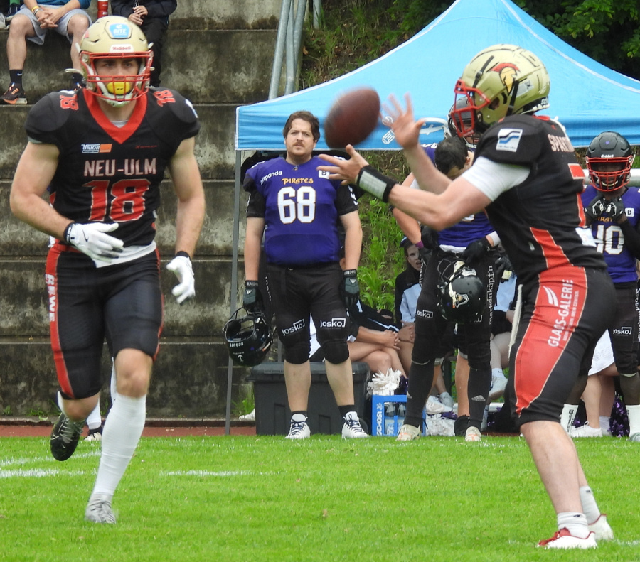 Auch Passau musste auf wichtige Akteure verzichten. Mit Quarterback Andrew Griffin und Allrounder Taivaughn Roach waren beide amerikanischen Spieler der Pirates angeschlagen und konnten nicht eingesetzt werden. Das machte das Leben für die Neu-Ulmer Defense einfacher, die aber auch keinen Zweifel ließ, dass sie auch gegen ein vollbesetztes Passauer Team die Oberhand gehabt hätte. Schon den ersten Angriff stoppte die Verteidigung im Ansatz und zwang Passau zum Punt. Zwei Spielzüge später erlief QB Sturgeon seinen ersten Touchdown (TD). Darauf folgte im ersten Viertel noch ein weiterer, dann ein tiefer Pass auf Wide Receiver Wesley Juszczak (#18 ), bevor Sturgeon seinen dritten Touchdown noch vor der Halbzeit erlief. Alle Extrapunkte verwandelte Max Walser (#56) gewohnt sicher. So stand es nach zwei Vierteln 28:00, obwohl bei nassem Wetter nicht jeder Pass gefangen wurde.