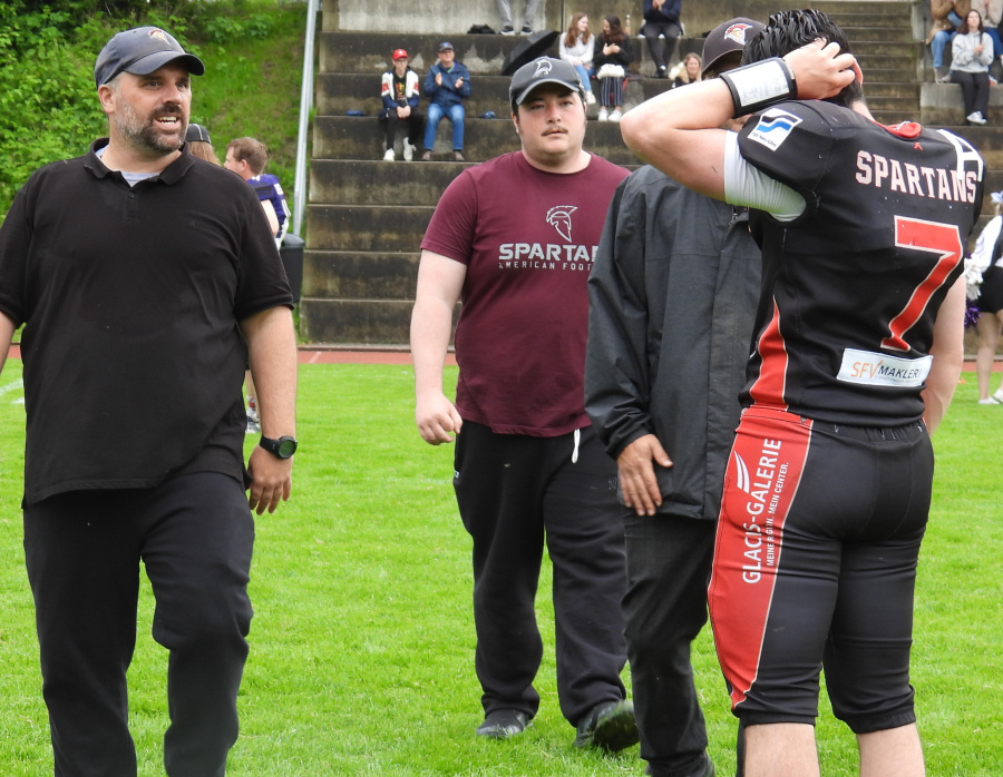 "Das war heute bei dem Wetter ein nicht immer schöner, aber doch überzeugender Auftritt der Mannschaft", so Headcoach Daniel Koch nach dem Spiel. "Wir konnten auch alle Spieler einsetzen und wollten gleichzeitigmit guter Energie aus dem Spiel gehen. Nächste Woche kommt ja eine schwere Aufgabe und die Vorentscheidung der Saison mit den noch ungeschlagenen Augsburg Centurions auf uns zu." Nach Augsburg reisen die Spartans am Samstag, 14. Juni als Tabellenzweiter. Das Ziel ist, mit einem Sieg die Tabellenspitze zu übernehmen. Wird allerdings eine Herkules-Aufgabe angesichts der vielen verletzungsbedingten Ausfälle. Da muss sich der Staff um den von den Konkurrenzteams durchweg hochgelobten Spartans Head Coach Koch noch einiges einfallen lassen.
