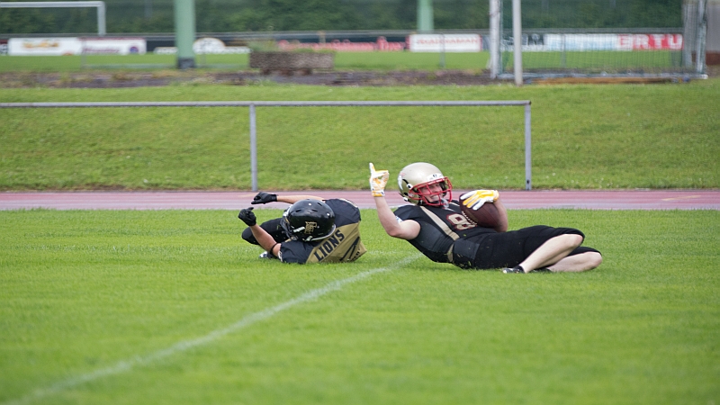 Bei der ersten Angriffsserie der Gäste aus Feldkichen demonstrierten die Footballer des TSV Neu-Ulm, dass sie auch diesem Spiel ihren Stempel aufdrücken wollen. Entsprechend stoppten die Spartans die Angriffsbemühungen der Lions. Marcus Fritz vertrat zu Spielbeginn den angeschlagenen Quarterback Robin Otto und führte die Spartans-Offense. Kleinere Abstimmungsschwierigkeiten, sowie eine konzentrierte Lions-Verteidigung sorgten dafür, dass auch die Hausherren schwer ins Spiel kamen. Sämtliche Angriffsbemühungen beider Teams wurden in der Folge durch die entsprechenden Verteidigungsreihen zunichte gemacht, daher endete das erste Viertel mit 0:0. Zu Beginn des zweiten Viertels gelang Steffen Ganghof ein Sack am Lions-Quarterback. Die Gäste entschlossen sich den vierten Versuch auszuspielen, der Pass misslang, woraufhin die Spartans nahe der gegnerischen Endzone das Angriffsrecht erlangten. Abermals verhinderte die Defense der Lions den Touchdown, weshalb Kicker Steffen Ganghof durch ein Field Goal die Spartans mit 3:0 in Führung brachte. Während der folgenden Angriffsserie der Lions sicherte Jermaine Wolff ein Fumble und brachte die Spartans in aussichtsreicher Position wieder in Ballbesitz. Der zurückkehrende QB Robin Otto nutzte die Gelegenheit und fand Michael Markgraf zum Touchdown. Beim Spielstand von 10:0 und dem überzeugenden Auftritt der Defensive schienen die Spartans das Spiel im Griff zu haben, zumal Steffen Ganghof und Christian Vogellehner ein erneuter Sack gelang. Doch kurz vor der Halbzeit waren es die Lions die sich durch ein Fumble den Ball sicherten und nach einem schönen Lauf zum 10:7-Halbzeitstand verkürzten. Aufgrund eines Gewitters verzögerte sich der Wiederanpfiff in Neu-Ulm um mehrere Minuten. Als das Spiel in den zweiten Spielabschnitt ging, drängten die Neu-Ulmer auf eine Entscheidung. Robin Otto durchbrach die gegnerische Verteidigung und erhöhte auf 17:7. Die Feldkirchen Lions zeigten ihren Kampfgeist und wollten sich nicht geschlagen geben. Sie kämpften sich an die 18 Yard Linie der Spartans und hatten die Möglichkeit wieder in Schlagdistanz zu kommen. Doch Antionio Petrone sicherte sich eine Interception und rannte 70 Yards bis kurz vor die gegnerische Endzone. Diese gute Feldposition ließ sich Robin Otto nicht nehmen. Durch einen Touchdown-Pass auf Fabian Schneider erhöhten die Hausherren zum Ende des 3.Viertels auf 24:7. Im letzten Quarter gelang es Christian Vogellehner den Lions Quarterback in der Endzone für einen Safety zu Fall zu bringen. Spätestens zum Zeitpunkt dieser 26:7 Führung war die Partie entschieden, daher entschied sich Head Coach Daniel Koch Chris King Einsatzzeit als Quarterback zu geben und den angeschlagenen Robin Otto zu schonen. Trotz mehrerer schöner Spielzüge sollte jedoch kein weiterer Touchdown erzielt werden. Einzig Steffen Ganghof brachte durch ein weiteres sicheres Field Goal erneut Punkte aufs Scoreboard. Den Schlusspunkt setzte Marcus Fritz mit einer gefangenen Interception bevor die Schiedsrichter zum 29:7 Heimsieg abpfiffen.