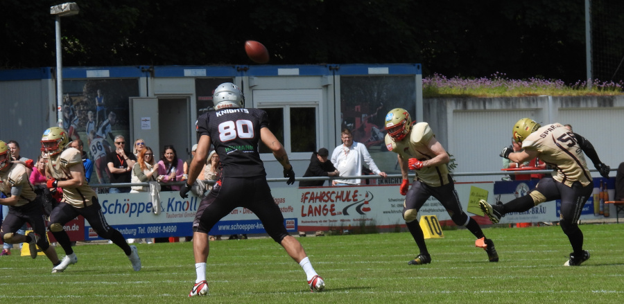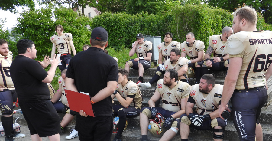 "Aus dem Mannschafts-Bus direkt in die Endzone der Franken Knights", hieß es für die Spartans, die American Footballer der TSV 1880 Neu-Ulm, beim Rückspiel in Rothenburg o. d. Tauber. Etliche Staus während der Anfahrt auf der A7 - für die 130 Kilometer brauchte das Team drei Stunden - hatten an den Nerven gezerrt und zu einigen Vorbereitungen auf der Fahrt gesorgt. So kamen die Spartans erst zwanzig Minuten vor dem geplanten Spielbeginn an. Nach Absprache mit Schiedsrichtern und Gegnern wurde der Kickoff dann zwar fünfzehn Minuten nach hinten verlegt; trotzdem blieb kaum Zeit zum Umziehen und Aufwärmen. Von den Widrigkeiten der Anfahrt zeigten sich die Neu-Ulmer völlig unbeeindruckt, schaltete ohne Federlesens auf Attacke und ließen dem Gastgeber kaum Chancen: Nach den vier mal zwölf Minuten (reine Spielzeit) stand auf dem Scoreboard: 56:13 (0:14 / 0:28 / 13:0 / 0:14) für Sparta.
