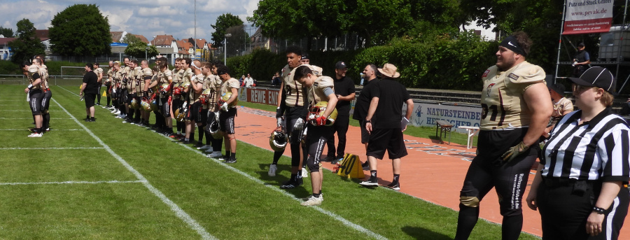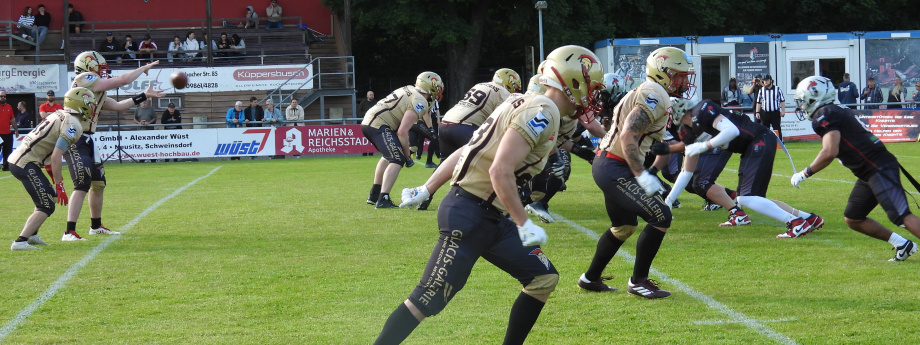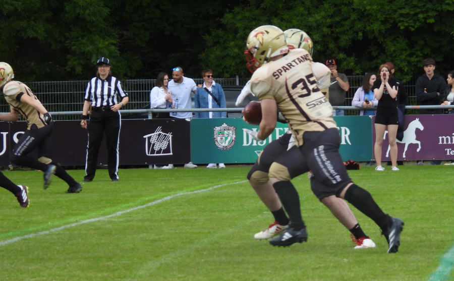 Die Spartans-Defense stoppte den Gegner sofort, und die Offense erzielte umgehend in wenigen Spielzügen den ersten Touchdown (TD). Bestens aufgelegt war wieder Running Back Ilhan Bahadir (#35). Hatte er im Hinspiel vor zwei Wochen im Muthenhölzle vier TDs erzielt, so sorgte er auch dieses Mal mit schönem Lauf für die ersten Punkte. Dass der Angriff der Spartans kaum zu stoppen war, lag aber vor allem an der Offense Line. Im Lauf blockten sie immer wieder große Lücken frei, im Pass schützten sie Quarterback (QB) Hunter Sturgeon (#6) vorbildlich. Der bedankte sich für die durch das gute Blocking gegebene Zeit mit tollen Pässen, Immer wieder auf Wide Receiver Wesley Juszczak (#18), der mit zwei TDs ebenfalls ein tragender Faktor war, aber auch auf Patrick Schempf (#9), Tobias Spohn (#81) und Luca Stieglbauer (#11).
