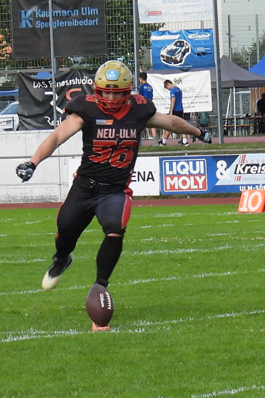 Dann zeigte auch die Rangers Offense eine schöne Serie mit vielen erfolgreichen Spielzügen, erzielte Touchdown und 2-Punkt-Conversion und verkürzte auf 28:14. Luca Stieglbauer (#2 ) trug den fälligen Kickoff der Rangers weit zurück bis an die gegnerische 40-Yard-Linie. Running Back Felix Klein zeigte mehrere schöne Läufe und dann legte wieder Schempf nach. Ein 18-Yard-Run mit erneut drei bis vier gebrochenen Tackles brachte den nächsten Touchdown. Extrapunkt Walser und die Führung war wieder auf 35:14 ausgebaut.