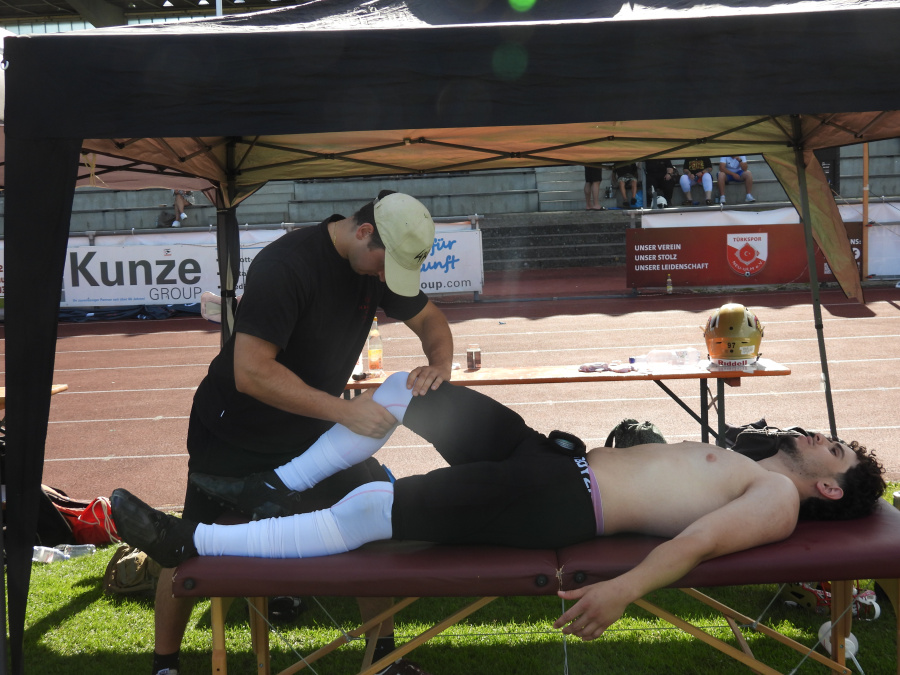 Sportliche Fairness: Der Physio der Spartans versorgt in der Halbzeitpause im Schatten des Spartans-Zelts einen Ranger.