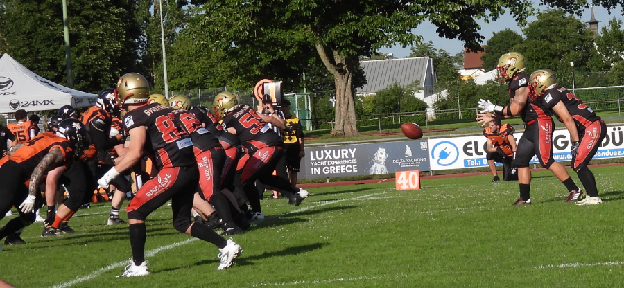 "Ich bin ein bisschen nervös, ich will so schnell wie möglich den Ball" sagte Patrick Schempf zu Beginn des Spiels und war daher froh, dass die Spartans den ersten Kickoff empfingen. Seine Nervosität hatte er ruckzuck abgelegt: Nach dem Kickoff der Rangers macht beim allerersten Angriff Running Back Felix Klein (#30) etliche Yards gut, direkt anschließend wirft Schempf einen 30-Yards-Pass auf seinen Wide Receiver an der linken Seitenlinie, Tobias Spohn (#81). Der fängt spektakulär, dreht sich und läuft die restlichen 30 Yards in die Endzone.