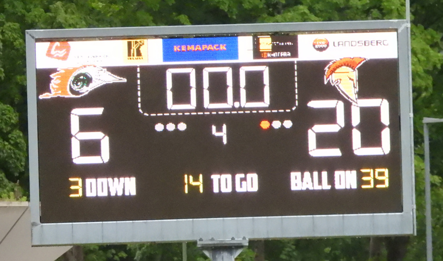 Hier zeigte sich die Stärke einerseits der Spartans Offense Line, die außerordentlich von Offense Coordinator Turner Sturgeon profitiert, der diese Positionsgruppe auch direkt trainiert, sowie andererseits die erfreuliche Tiefe auf der Running Back Position, welche viele Variationsmöglichkeiten bietet. Demzufolge steuerten auch in Landsberg Dirk Mainka (#34), Mike Höchsmann (#16) und Felix Klein (#30) allesamt tolle Läufe bei, wobei Mainka und Höchsmann je einen Touchdown erliefen, der auch ansonsten überaus agile Quarterback (QB) Hunter Sturgeon (#7) hatte mit einem ersten TD vorgelegt. Für zwei Extra-Punkte kickte Max Walser (#56) durchs Gestänge.