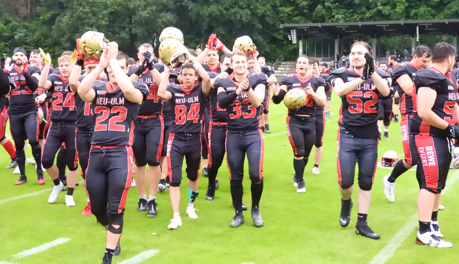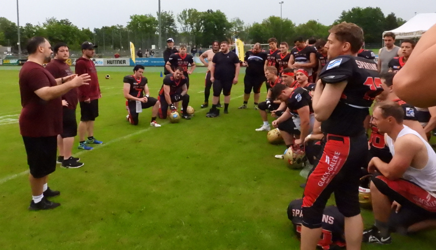 Head Coach und Spartans-Sportdirektor Daniel Koch (links vorn, rechts daneben Turner Sturgeon und Jonas Hoffmann), zog das Fazit: "Eine sehr geschlossene Mannschaftsleistung hat heute den Sieg gebracht. Da ist die Vorbereitung auf das Rückspiel schon in einer Woche gar nicht so einfach. Denn es gibt wenig Fehler abzustellen und Landsberg wird sicher mit einigen Überraschungen kommen. Sie konnten unser Laufspiel kaum stoppen und gegen unsere Defense den Ball nicht konsequent bewegen. Auf mögliche neue Konzepte müssen wir nächsten Samstag als flexibel reagieren können. Und wenn das Wetter besser ist, wird einen großen Einfluss haben, wer das Passspiel für sich nutzen kann. Sollte eine spannende Partie werden und für uns ein weiterer wichtiger Schritt sein, um im Meisterschaftsrennen eng dabei zu bleiben."