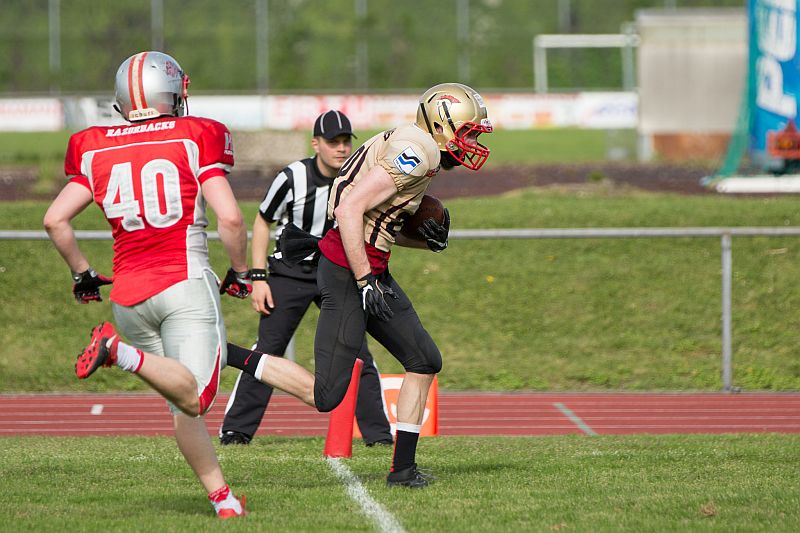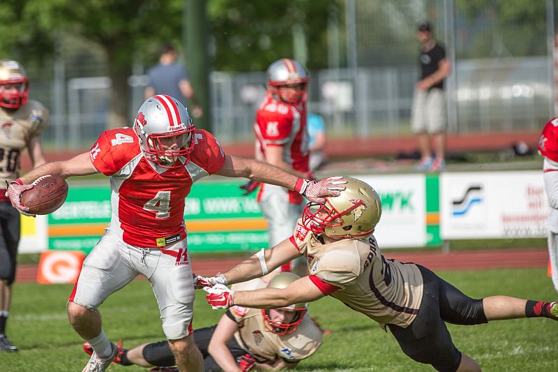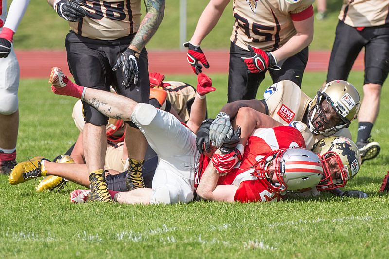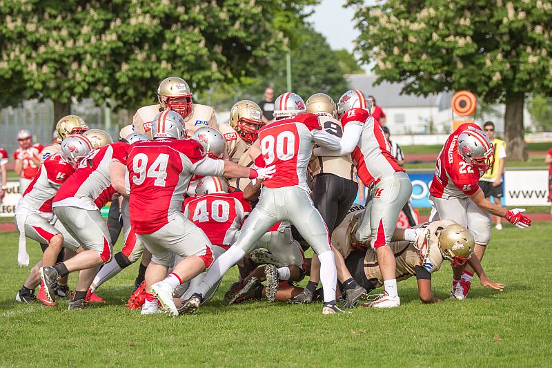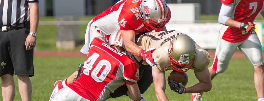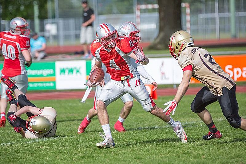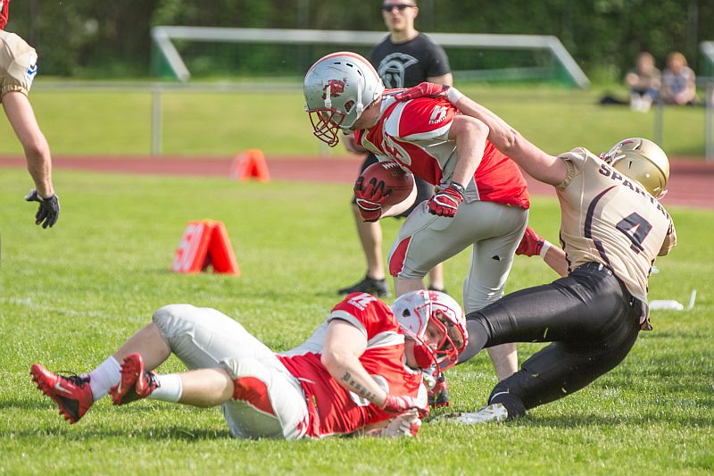 Die Partie begann direkt mit einem Paukenschlag. Beim ersten Spielzug der Razorbacks sicherte Saladin Dunnoo durch eine Interception den Ballbesitz für die Neu-Ulmer und Spartans Quarterback Robin Otto fand kurz darauf Jonas Urbanski in der Endzone, welcher mit seinem ersten Touchdown die Hausherren in Führung brachte. Die Brucker zeigten sich von diesem Rückschlag jedoch keinesfalls aus dem Konzept gebracht und setzten verstärkt auf ihr dominantes Laufspiel. In der Folge zeigten beide Teams, dass sie gewillt waren bereits früh Risiken einzugehen um an diesem Tag als Sieger vom Platz zu gehen. So wurden auf beiden Seiten vierte Versuche ausgespielt, welche jedoch oftmals von den präsenten Defensivreihen gestoppt wurden. Vor Ende des ersten Viertels bewiesen die Gäste ihre Gefährlichkeit und kamen zum 7:7 Ausgleich, nachdem die durch die linke Seite durchbrachen und über 45 Yards in die Endzone liefen. Auch im zweiten Viertel ließen beide Teams nichts an Intensität vermissen. Die Fursty Razorbacks bereiteten mit ihrem Laufspiel der Neu-Ulmer Defensive weiterhin Probleme und gingen dementsprechend nach einem Run durch die Mitte mit 14:7 in Führung. Auf Spartans-Seite arbeitete sich das Team Stück für Stück an die gegnerische Endzone. Dabei lebten die Angriffsbemühungen vor allem von der Flexibilität. Pässe auf Luca Daumenlang, Läufe durch Aleks Macanovic oder Sneaks durch Robin Otto waren für Fürstenfeldbruck nur schwer auszurechnen. Folgerichtig war es ein solcher Sneak von Robin Otto, der die Spartans aus 2 Yards zum Ausgleich brachte. Vor Pausenpfiff hatten die Gäste jedoch die Möglichkeit erneut in Führung zu gehen, doch die Abwehr um Captain Christian Vogellehner ließ keinen weiteren Touchdown zu. Die Razorbacks entschlossen sich daher mit einem Field Goal die Halbzeitführung herzustellen, doch die Defensive war erneut wachsam und konnte den Versuch blocken.