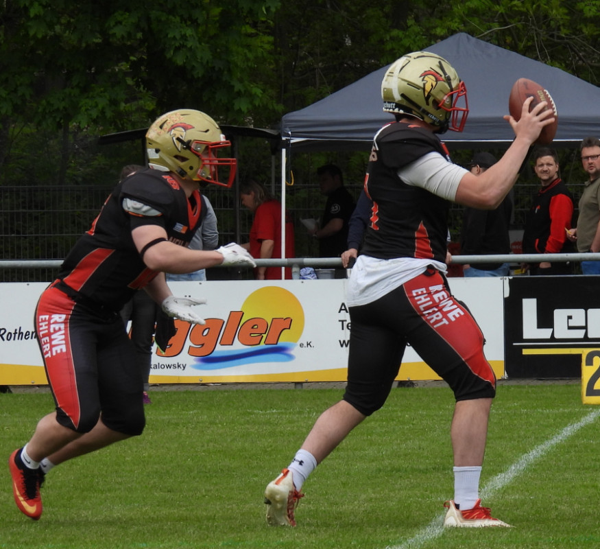 Spartans-Headcoach Daniel Koch: "Die Knights haben mit Patrick Cosby (#26 ) einen sehr starken Ballträger, was der neue QB der Knights weidlich zu nutzen wusste. Cosby hatte uns in der vergangenen Saison schon vor so einige Aufgaben gestellt. Wir wussten: Da muss unsere ganze Defense aktiv den Lauf verteidigen. Da wir aber zu Beginn der zweiten Halbzeit den Ball hatten, sahen wir gute Chancen, das Spiel gleich wieder zu drehen."