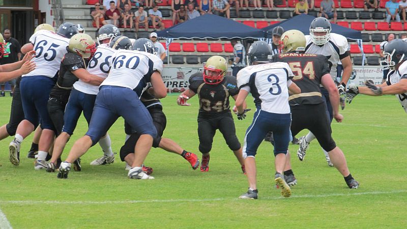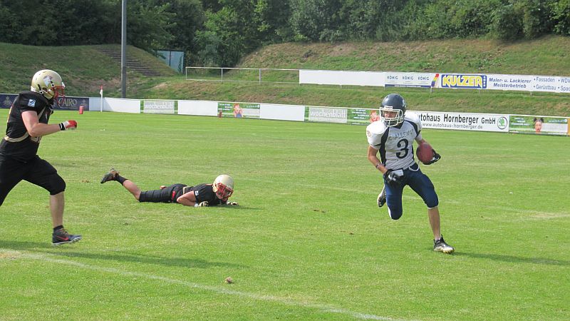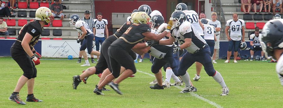 Dabei erwischten die Footballer des TSV Neu-Ulm einen rabenschwarzen Start in das Spiel. Bereits im dritten Spielzug der Partie fanden die Spiders in die Endzone der Donaustädter zur 7:0 Führung. Als die Offense der Spartans am Zug war, zeigten sich schon einige Unkonzentriertheiten, die sich den Großteil des Nachmittags hindurchziehen sollten. Besser machten es die Gastgeber, die erneut einen Fehler in der Neu-Ulmer Defensive zum 13:0 ausnutzten. Die Spiders schienen das Spiel nach Belieben zu kontrollieren. So durchbrachen sie gegen Ende des ersten Viertels gleich drei Tackleversuche der Spartans und erhöhten auf 21:0. Auch im zweiten Quarter zeigten die Straubinger den besseren Start. Durch einen erneuten Outside Run erhöhten sie auf 29:0. Es drohte ein Debakel für die Spartans, bei denen bis dato nahezu nichts zusammenlief. Gegen Mitte des zweiten Viertels gelang es den Neu-Ulmern endlich etwas Konstanz in ihr Angriffsspiel zu bringen. Robin Otto fand Fabian Schneider zum ersten Touchdown für die Spartans. Wenig später war es Pascal Liebl, der auf 29:14 verkürzte. Kurz vor der Halbzeit waren es jedoch erneut die Spiders, die durch einen Touchdown den 36:14 Halbzeitstand herstellten. In der Halbzeitpause fand Spartans Head Coach klare Worte. Scheinbar hatte die Halbzeitansprache Erfolg, denn zu Beginn der zweiten Spielhälfte wurden die Spartans stärker. Robin Otto fand erneut Pascal Liebl für einen Touchdown, bevor er kurze Zeit später selbst in die Endzone fand. Die Spartans kämpften sich bei 36:28 wieder auf einen Score heran. Nachdem zwischenzeitlich auch die Defense die Spiders stoppen konnte, schien das Spiel zu kippen. Doch die Aufholjagd sollte letztendlich vergebens sein. Die Niederbayern zogen zum Ende des 3. Viertels mit 43:28 davon. Dieser Touchdown schien die aufkommende Hoffnung im Neu-Ulmer Lager zu ersticken, denn im Schlussviertel konnten die Spartans nicht an ihre gute Phase anknüpfen. Wie zu Beginn des Spiels wurden Pässe nicht gefangen, Gegner nicht richtig geblockt und nach einem Fumble, sowie einer Interception, kamen lediglich die Gastgeber zu weiteren Punkten. Am Ende stand ein deutlicher, aber verdienter, Sieg der Straubing Spiders.