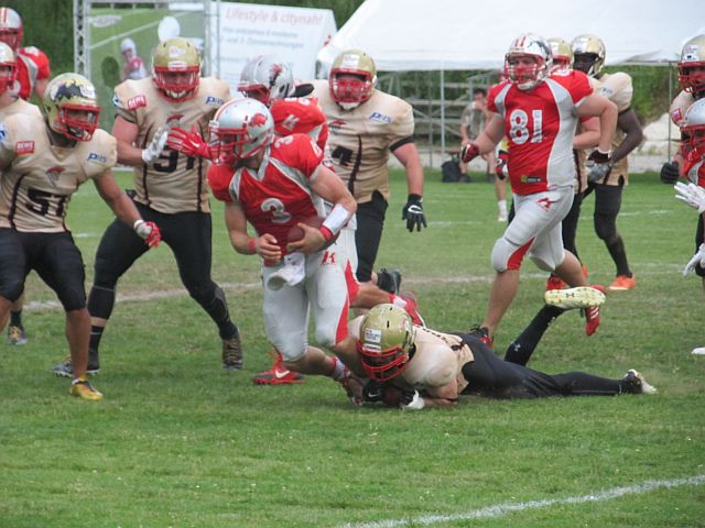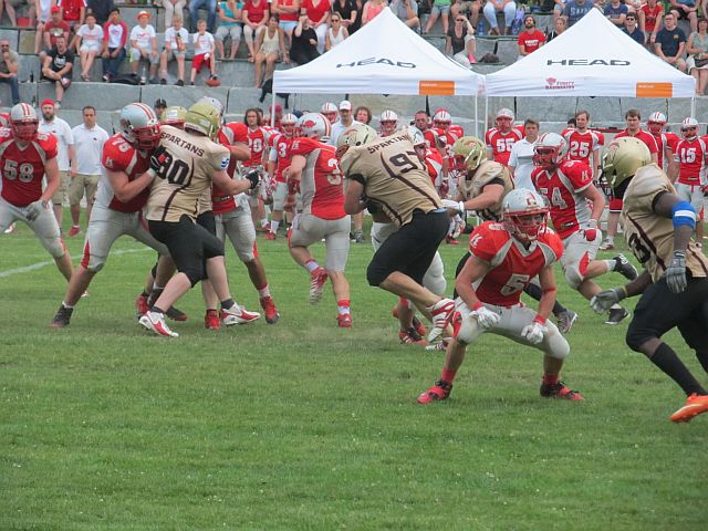 Es gibt einfach Tage, an denen einem nichts gelingt und dem Gegner alles. Einen solchen erwischten die Footballer des TSV Neu-Ulm bei ihrem Gastspiel in Fürstenfeldbruck. Während die Gastgeber bei nahezu jedem Ballbesitz Punkte erzielten, konnten die Donaustädter zwar lange mithalten, mussten sich am Ende jedoch geschlagen geben. Zu Beginn der Partie entwickelte sich ein Spiel auf Augenhöhe. Gingen die Razorbacks mit ihrem ersten Ballbesitz in Führung, glichen die Spartans durch Lasse Bartels direkt aus. Schaffte Fursty einen Touchdown mit 2-Point Conversion, gelang Robin Otto das selbe. Erst gegen Ende der ersten Halbzeit konnten die Razorbacks etwas davonziehen, nachdem es ihnen erstmals gelang die Spartans zum Punt zu zwingen. In der zweiten Spielhälfte entwickelten die Brucker ein Übergewicht und zogen davon. Zwar ging die Spartans Offensive oftmals auf volles Risiko und wurde belohnt, etwa mit tiefen Pässen bei vierten Versuchen und einem erfolgreichen Onside-Kick, doch die ersatzgeschwächte Defensive konnte dem Druck der Razorbacks nichts entgegensetzen. Während die Gastgeber weiter punkteten, fand bei den Spartans lediglich Luca Daumenlang zweimal den Weg in die Endzone. Entsprechend deutlich stand am Ende das Ergebnis von 50:27 und die Tabellenspitze für die Fursty Razorbacks.