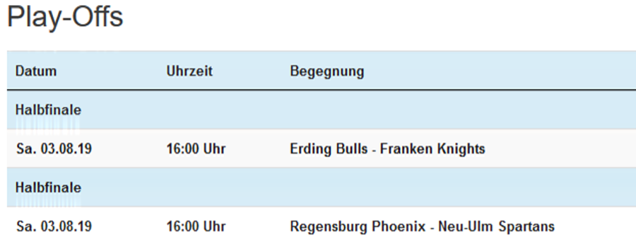Favorit wie damals sind die Spartans keinesfalls. Nach einer Steigerung im Laufe der Saison konnte man die Augsburg Raptors überholen und so in der hart umkämpften Süd-Gruppe den zweiten Platz erobern. Also müssen die Neu-Ulmer gegen den Meister der Bayernliga Nord das Halbfinale bestreiten. Und der Meister der Südgruppe, die Erding Bulls, gegen welche die Spartans zwei Niederlagen hinnehmen mussten, haben den Zweiten von Nord zu Gast, die Franken Knights aus Rothenburg.