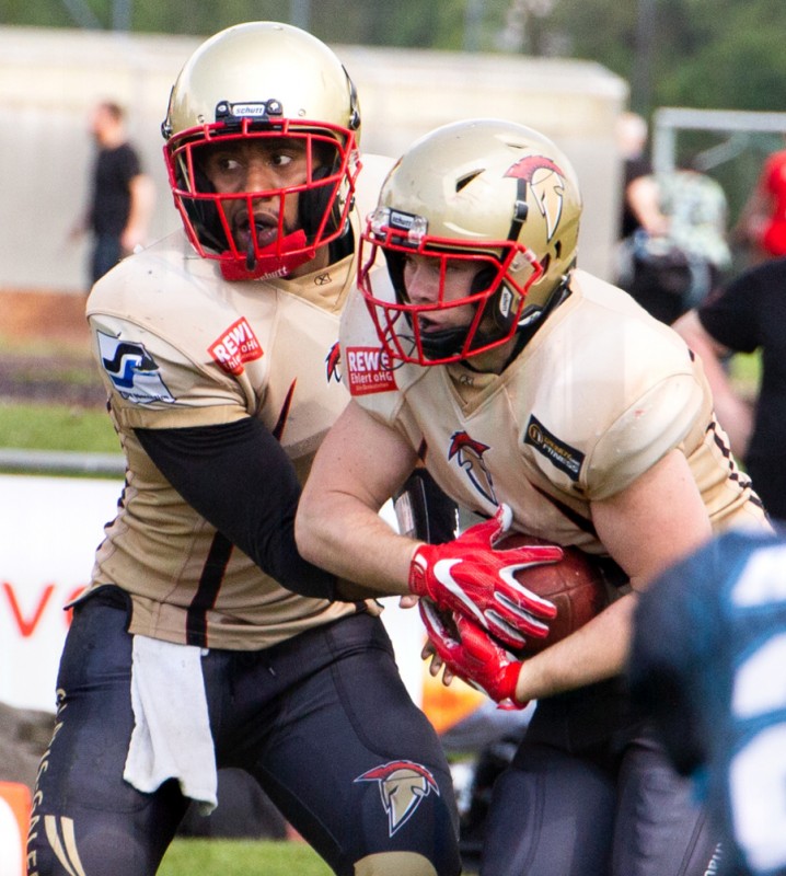 Wenn ihre Übergaben immer gut klappen, ist das schon eine Vorstufe zum Erfolg: Quarterback Eddie Jewel (#2), Matthias Ast (#21).