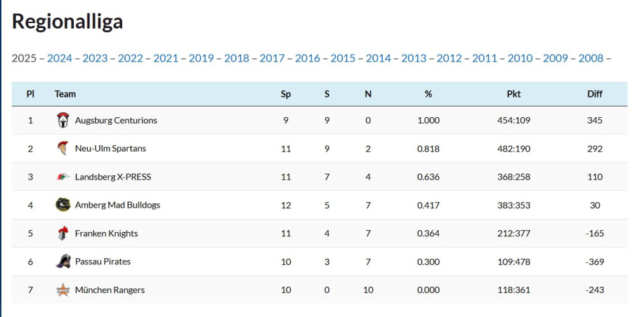 An diesem Samstag, 09. August (Kickoff: 16 Uhr) kommt es zum Gipfeltreffen in der Football-Regionalliga Süd: Die auf dem zweiten Tabellenplatz rangierenden Neu-Ulm Spartans empfangen im Muthenhölzle den bislang in der Saison ungeschlagenen Spitzenreiter: die Augsburg Centurions. Stünde da nicht die absolut unnötige Heim-Niederlage (21:27) des American Football-Team im TSV Neu-Ulm zu Buche gegen den im Rückspiel in Landsberg dann mit 52:6 mehr als deutlich geschlagenen X-Press, hätten die Neu-Ulmer noch eine Chance gehabt, mit dem Liga-Primus die Position zu tauschen. Voraussetzung wäre: Die Spartans bringen 23 Punkte mehr aufs Scoreboard als der Gegner (Spartans-Niederlage im Hinspiel nach Verletzung bereits im ersten Quarter von Quarterback Hunter Sturgeon mit 6:29). Hätte, wäre – die Chance ist nicht mehr gegeben, aber auf jeden Fall wollen die Footballer im TSV Neu-Ulm die Saison mit zehn Siegen und nur zwei Niederlagen abschließen und zeigen, dass sie auch die Centurions schlagen können.