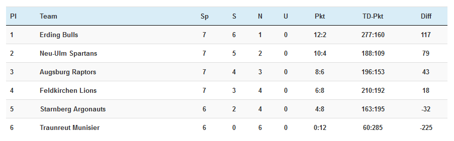 Die aktuelle Tabelle. Mit einem Sieg im Nächsten Spiel (am 23. Juni in Augsburg gegen die Raptors) kann der zweite Platz erobert werden und unsere Defense die beste der Liga bleiben.
