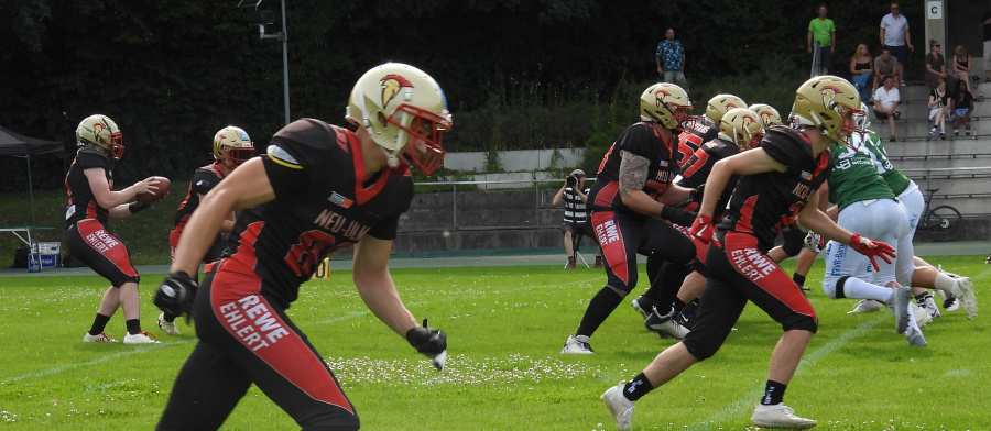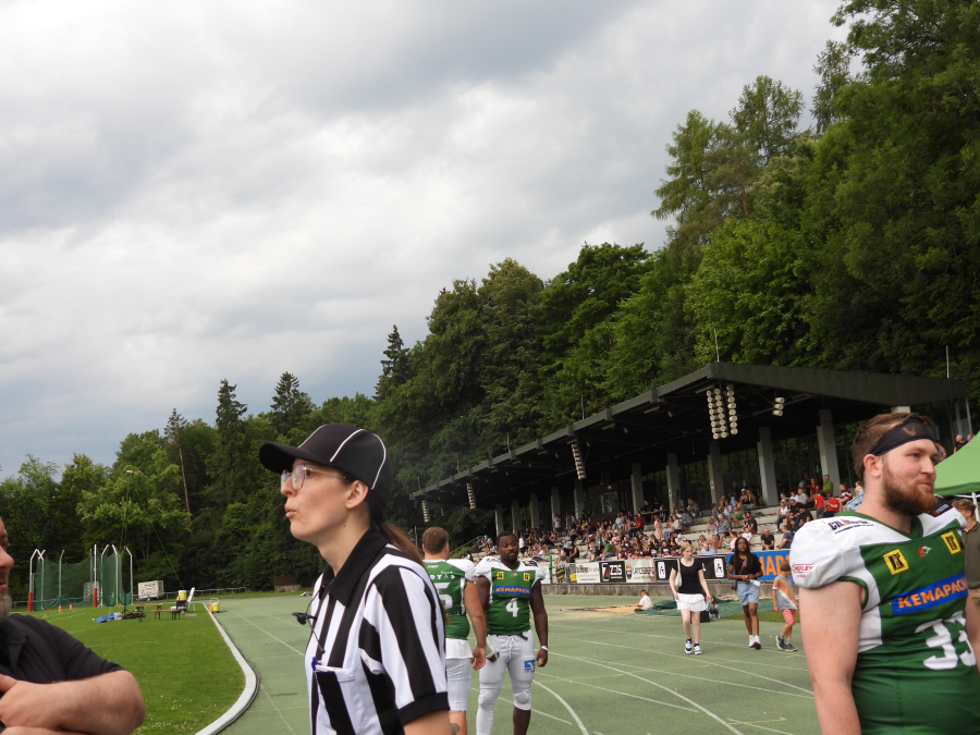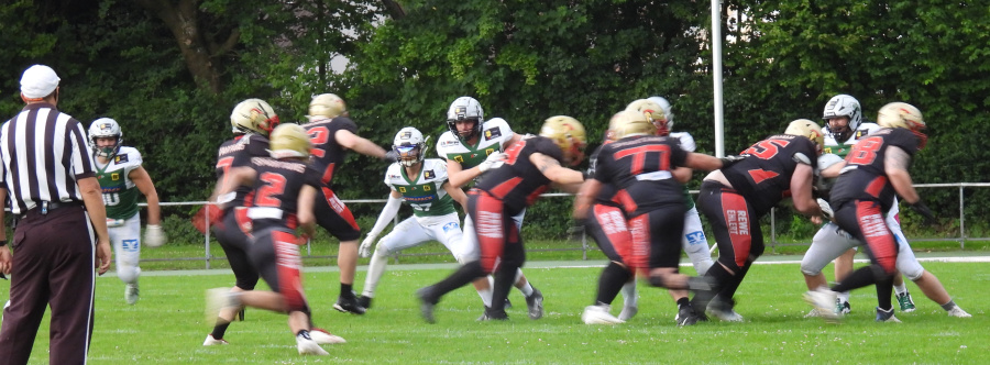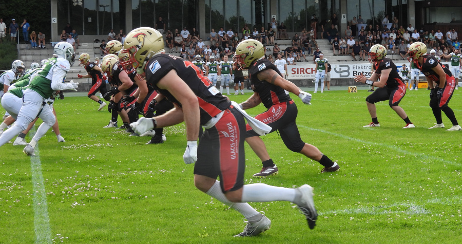 Aber dann – im vierten Spielabschnitt erlief Hunter Sturgeon einen TD, verteilte den Ball gut an seine Receiver Wesley Juszczak, Patrick Schempf (#9) und Tobias Spohn (#81) und Running Back Felix Klein (#30) krönte seine sehr gute Leistung mit einem Lauf-TD sowie mit einem gefangenen TD nach Pass von Sturgeon. Linebacker Max Walser verwandelte alle drei PAT gewohnt zuverlässig und verhinderte darüber hinaus einen weiteren Landsberger Punt im Ansatz, indem er den Punter zu Boden brachte, bevor dieser den Ball los werden konnte.