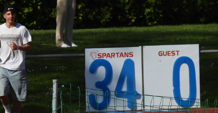 Auch wenn es nun kurz so aussah, als kämen die Gäste besser ins Spiel, machten die Spartaner diese Hoffnungen schnell zunichte. Ein schöner Pass von QB Sturgeon auf Teamcaptain Patrick Schempf (#9), ein Lauf-Touchdown von Spielmacher Sturgeon, eine zweite 2-Point-Conversion von Dirk Mainka und eine Interception von Elias Mauritius (#23) brachten ein klares 34:00 zur Halbzeit.