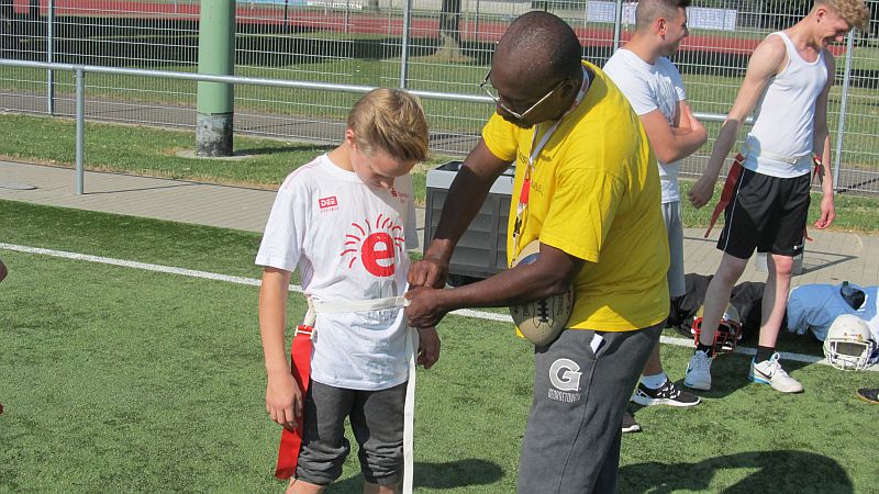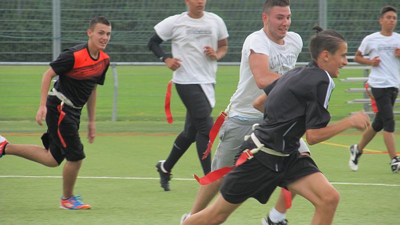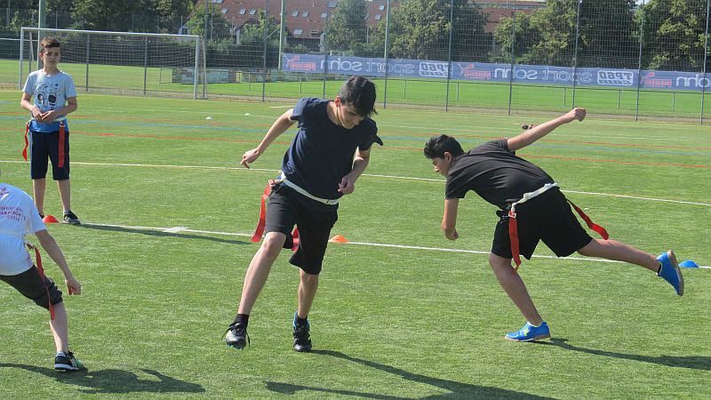 American Football liegt an der Donau derzeit im Trend. Aus diesem Grund fragte die Anna-Essinger-Realschule Ulm bei den Spartans an, ob diese sich an deren Trendsporttag beteiligen würden. Selbstverständlich sagten die Footballer des TSV Neu-Ulm zu und veranstalteten für die rund 20 Interessierten am gestrigen Mittwoch eine eigene Trainingseinheit. Unter der Leitung von Jugend-Coach Richard Addison und Senior-Spieler Saladin Dunoo erhielten die Schülerinnen und Schüler Einblicke in diesen spannenden Sport. Nach einer kurzen Regelkunde, folgte ein ausgiebiges Aufwärmprogramm, bevor in mehreren Gruppen verschiedene Positionen ausprobiert werden konnten. Um ein mögliches Verletzungsrisiko zu minimieren und den Fokus auf die Athletik zu legen, entschieden sich die Spartans für diverse Offense- und Defenseübungen des Flag Football. So lernten die Jugendlichen unter anderem das sichere Fangen, den korrekten Pass, sowie mehrere Abwehrmöglichkeiten und -techniken. Gegen Ende des rund zweieinhalbstündigen Trainings veranstalteten die Realschüler natürlich ein kleines Trainingsspiel. Als Abschluss eines gelungenen Sporttages hatten die Spartans noch eine kleine Überraschung parat. Jeder Teilnehmer erhielt ein kleines Geschenk und eine Einladung zum kommenden Heimspiel am 25.07. gegen die Landsberg X-Press.