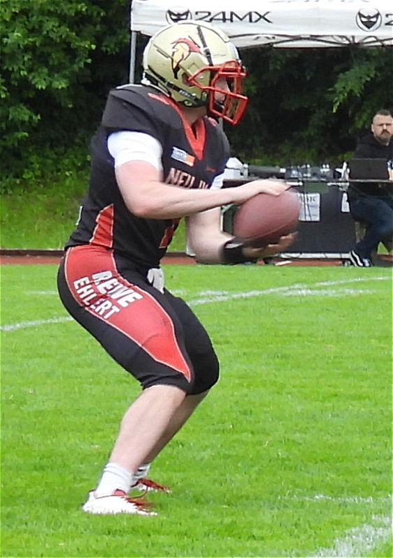Als QB musste so schon im ersten Viertel Patrick Schempf (#9) einspringen. Damit fiel er - auf seiner angestammten Position als Receiver regelmäßig ausgesprochen erfolgreich - als Anspielstation aus, wodurch die Angriffsvarianten deutlich weiter reduziert wurden. Obwohl Schempf die QB-Position zuletzt vor zwei Jahren trainiert hatte, machte er seine Sache als Sturgeon-Ersatz sehr gut, zeigte großen Einsatz, fand immer wieder Tobias Spohn und Wesley Juszczak (#18) mit seinen Pässen und steuerte selbst kraftvolle Läufe bei. Den überragenden Stamm-QB ersetzen konnte er aber verständlicherweise nicht in Gänze.