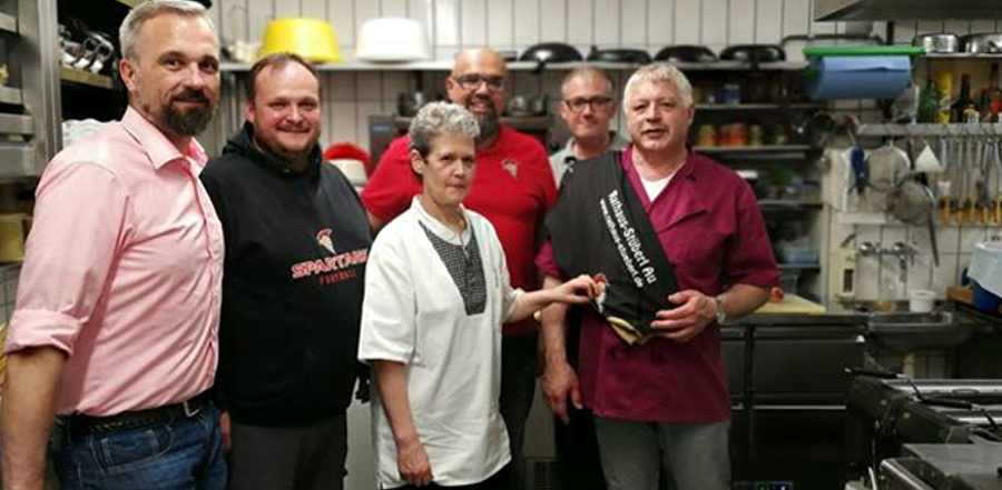 Auf dem Foto von links: Alexander Michel (1. Vorsitzender des Fördervereins), Klaus Weiß (Abteilungsleiter American Football im TSV 1880 Neu-Ulm), Inge Eckel (Wirtin des Rathaus-Stüberl Au in Illertissen/Au), David Gonzalez (Defense-Line-Coach und Kontakt), Thomas Böttinger (2. Vorsitzender des Fördervereins) und Gottfried Kuisl (der Wirt des Rathaus Stüberl Au in Illertissen/Au).