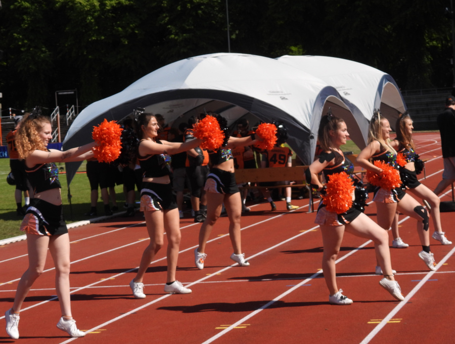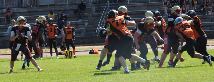 Dafür hatten gesorgt: Running Back Dirk Mainka (#34) mit einem Lauf-Touchdown 7:0 , Wide Receiver Patrick Schempf (#9) nach Pass von Hunter Sturgeon (#7) in die gegnerische Endzone 14:0, Running Back Yosley Azcuy-Povea (#25) durch einen Lauf-Touchdown 21:00, Linebacker Max Walser (#56) durch einen Interception-Return-Touchdown 28:00 und einen Lauf Touchdown von Hunter Sturgeon 35:00.