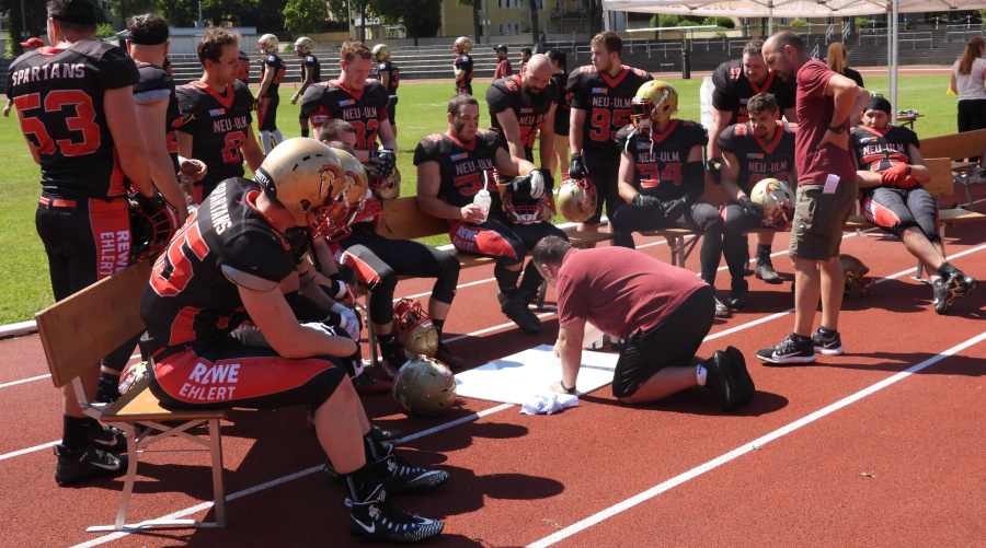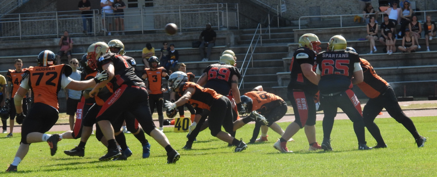 Es war die Begegnung zwischen dem Tabellenletzten aus der Isar-Metropole und dem wieder auf Platz 1 der Tabelle gerückten Aufsteiger aus Neu-Um. Hatte dieser schon sein Heimspiel deutlich mit 42:7 gewonnen, so setzten die Männer um Quarterback Hunter Sturgeon auswärts im Rückspiel zur großen Freude der zahlreich mitgereisten Fans noch mal eins drauf. Dabei war die erste Halbzeit fast eine Doublette der ersten Begegnung – wieder hieß es zum Pausentee 35:0 für Sparta.