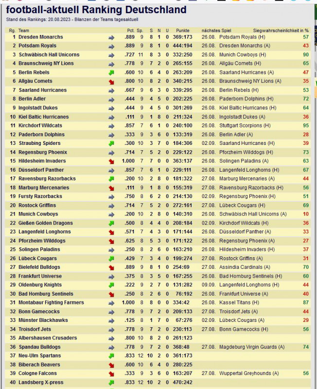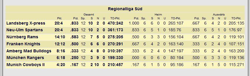 Tatsächlich haben sich die Spartans auch im Power-Ranking des online-Fachportals "Football Aktuell" inzwischen auf Rang 37 unter allen Teams in Deutschland vorgearbeitet. Und auch die Abschluss-Tabelle gibt einigen Aufschluss, weist zum Beispiel die Qualität der Defense aus und gibt den Fingerzeig: Die Offense muss sich noch entwickeln. Es wurden im Durchschnitt nur wenige gegnerische Scores zugelassen, aber die Offense hat dann doch manchmal vergleichsweise mäßig gepunktet - beispielweise im unerwartet mit 10:11 so knapp verlorenen Heim-Spiel (!) gegen die Rams, was letztlich die Meisterschaft kostete.