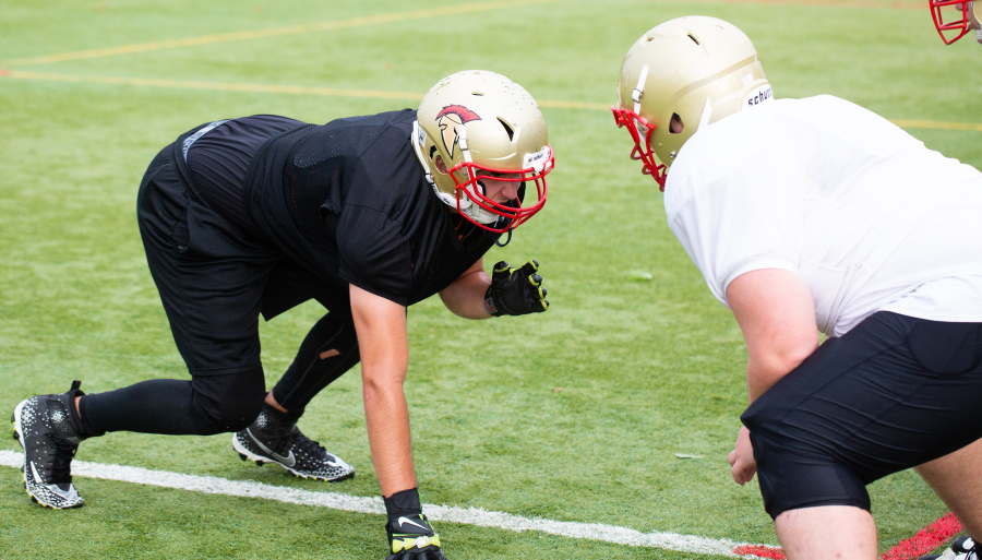 Mit Martin Grunert (Foto links, im Dress seines neuen Teams) hatte die U19 im Jahr 2017 ein besonderes „Aushängeschild“. Der Cornerback für die Teilnahme an der Jugendeuropameisterschaft in Paris immerhin einen Nachrückerplatz in der Jugend-Nationalmannschaft. Die Seniors hätten ihn mit offenen Armen aufgenommen, aber – wegen der Aufnahme des Studiums in Freiburg wechselte Martin zu Beginn dieser Saison zu den Freiburg Sacristans. Die haben den in der Jugend der Spartans bestens ausgebildeten Cornerback mit Handkuss bei sich aufgenommen. Er hat auch gleich die ersten beiden Matches der Saison gespielt und viel Einsatzzeit bekommen, musste aber dann aufgrund von Achillessehnenproblemen die nächsten drei Spiele aussetzen oder lediglich Kicker spielen. Nachdem die Verletzung abgeklungen war, konnte er seine Klasse unter Beweis stellen, indem er beim "Comeback" im ersten Spiel drei Pass-break-ups und am Ende eine Interception in der Endzone fertigbrachte und mit diesen Einzelleistungen entscheidend zum 14:14 Endstand beitrug.