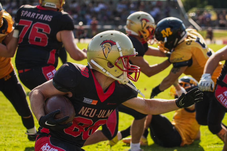 Wer angenommen hatte, beim Heimspiel gegen die Munich Cowboys II würden die TSV Neu-Ulm Spartans nix, aber auch gar nix anbrennen lassen, wird sich verwundert die Augen gerieben haben: Hatte doch der Aufsteiger aus Neu-Ulm nicht nur das Hinspiel zum Saisonauftakt in München mit 17:8 gewonnen, sondern dann bis auf ein Match (gegen Nürnberg Rams) alle anderen Begegnungen mehr als klar gewonnen und längst die Tabellenspitze erobert. Somit war das Team eindeutig Favorit. Pustekuchen – am Ende hieß es zwar 35:6 (7:6 / 0:0 / 0:0 / 28:0), aber bis zum letzten Quarter taten sich die Neu-Ulmer Football-Cracks auf heimischen Grund im Dietrich-Lang-Sportzentrum erstaunlich schwer gegen die zweite Mannschaft des Erstligisten aus der Isarmetropole – um dann allerdings nochmal kräftig aufzutrumpfen.