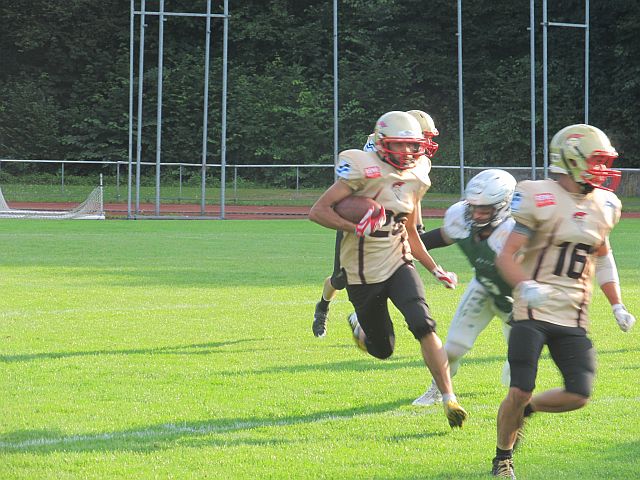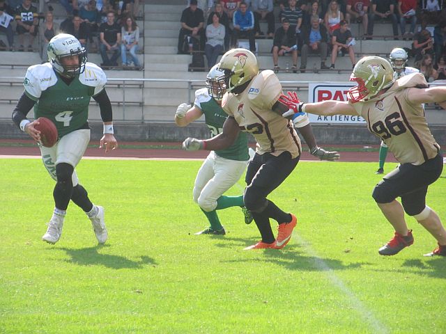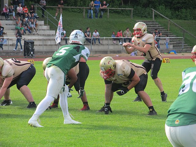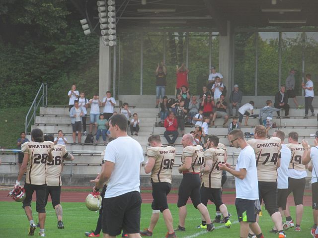 Spartans Head Coach Daniel Koch musste seine Mannschaft verletzungsbedingt auf mehreren Positionen umstellen. Entsprechend war deutlich bemerkbar, dass das Team in dieser neuen Besetzung einige Abstimmungsschwierigkeiten auswies. Maximilian Bär ersetzte Stamm-Quarterback Robin Otto und leitete die Angriffe der Neu-Ulmer. Auch wenn zum Spielende keine Punkte stehen sollten, demonstrierte er bei seinem QB-Debut versprechende Ansätze. Ganz anders hingegen zeigte sich der Gastgeber aus Landsberg, der sich bestens auf die Spartans eingestellt hatte und die Schwäche der Gäste konsequent ausnutzte. Konnten das erste Viertel noch knapp bei 6:0 gehalten werden, sicherte sich Landsberg in den zweiten und dritten Vierteln einen deutlichen Vorsprung. Dabei waren sie vor allem mit tiefen Pässen gegen die dezimierte Defensive erfolgreich. Neu-Ulm versuchte sich gegen die Niederlage zu stemmen , doch gegen die Landsberger war an diesem Tag nichts zu holen.