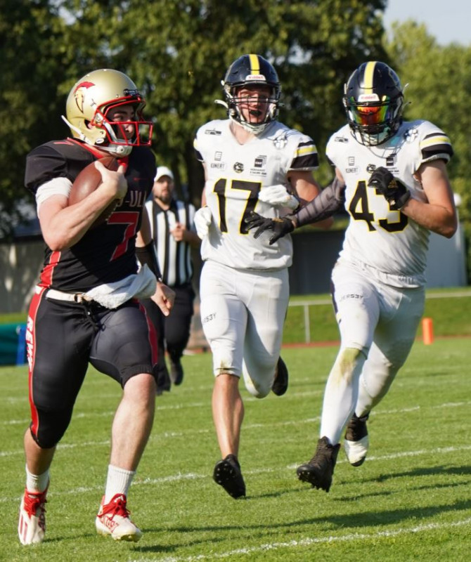 Die erste Anrgiffsserie in diesem letzten Heim-Match der Saison schloss Running Back Dirk Mainka (#34) mit einem 25-Yard-Lauf zum Touchdown ab. Den fälligen Zusatzpunkt (PAT) erkickte Max Walser (#56 ). Einen zweiten Offense-Touchdown später stand es dann schon 14:00, bevor Cormerback Elias Mauritius (#23) einen Pass von Gäste-Quarterback Joshua Mills abfing und direkt für 70 Yards in die Endzone trug.
