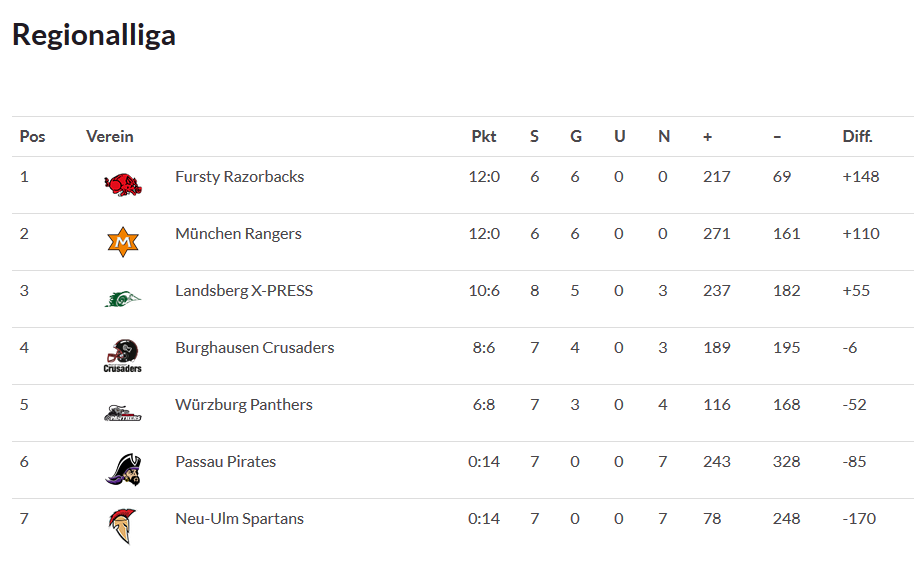 Die Teams, gegen die sich die Spartans in diesem Jahr durchsetzen müssen, wenn sie in der nächsten Spielzeit nicht eine Liga drunter spielen wollen, haben am Wochenende auch wieder verloren. Aber beide Ergebnisse lassen doch aufhorchen, weil sie knapp waren. Die Würzburg Panthers unterlagen im Heimspiel dem Landsberg X-Press denkbar knapp 20:21 (0:7 / 14:0 / 0:7 / 6:7). Und die Aufsteiger Passau Pirates trotzen den Burghausen Crusaders auf deren heimischen Territorium ein nicht minder knappes 48:45 (14:7 / 13:10 / 8:22 / 13:6) ab.