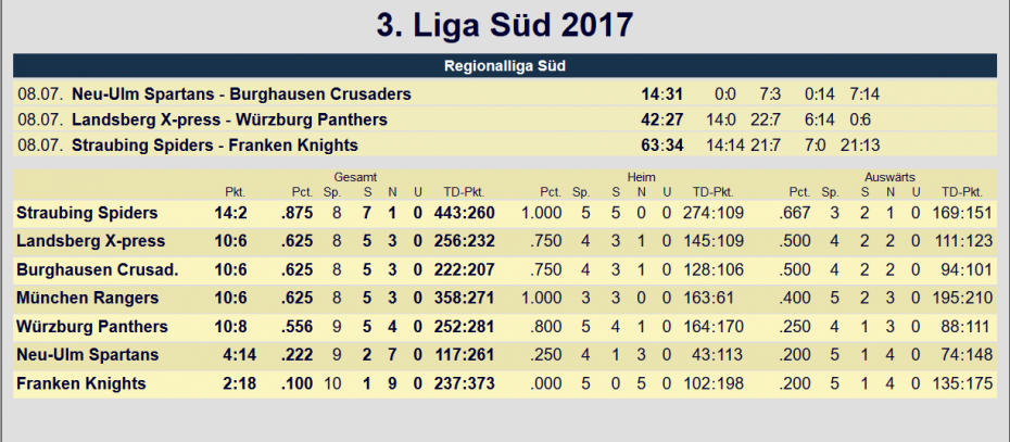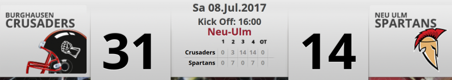 Bis zur Halbzeit im Football-Regionalliga-Heimspiel sah es ganz danach aus, als könnten die Neu-Ulm Spartans ihre erklärte Absicht verwirklichen und endlich mal wieder ein Match zu ihren Gunsten entscheiden. Da stand es 7:3 gegen die Burghausen Crusaders und es sah ganz nach einem Neu-Ulmer Erfolg aus. Entgegen ihrer Gewohnheit, nach der Pause einen Zahn zuzulegen und stärker zu werden, ließen die Gastgeber dann aber im dritten Quarter wie auch im Schlussviertel zwei Touchdowns des Gegners zu, konnten aber selbst nur ein Mal noch in die gegnerische Endzone gelangen. So endete das Spiel 14:31 (0:0 / 7:3 / 0:14 / 7:14). „Nach ner Niederlage ist es natürlich schwierig, völlig glücklich zu sein“, gibt Spartans-Cheftrainer Daniel Koch im Presse-Interview zu Protokoll, „aber ich sag mal so: Ich bin dennoch relativ zufrieden.“