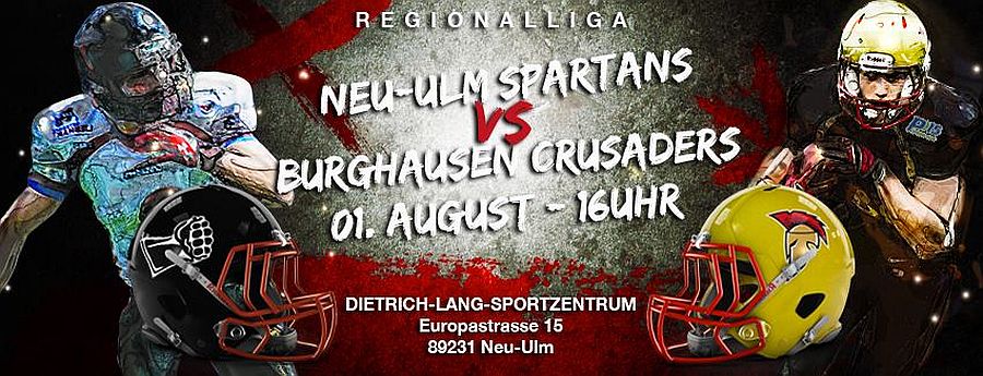 Wenn die Neu-Ulm Spartans am Samstag, 01.08.15, um 16 Uhr die Burghausen Crusaders zum letzten Spiel der Regionalligasaison 2015 empfangen, steht die Begegnung unter besonderen Vorzeichen. Bereits im vergangenen Jahr trafen beide Mannschaften im Finale der Bayernliga aufeinander, mit dem besseren Ende für die Donaustädter. Dieses Jahr ist das Saisonfinale abermals ein Endspiel für die Spartans, denn mit einem Sieg kann kann sich die Footballabteilung des TSV Neu-Ulm den Meistertitel sichern.