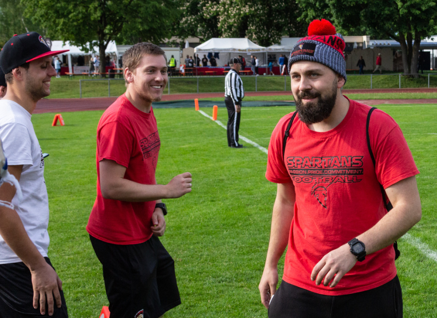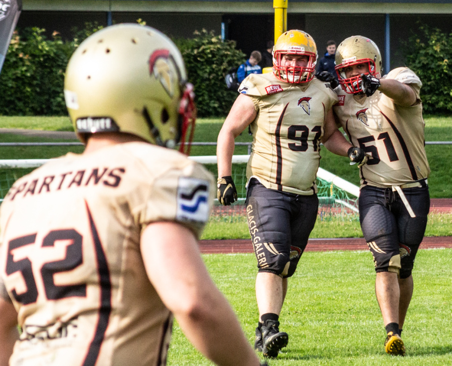 Wenn ein Team zu Null spielt, kann in der Defense nicht viel falsch gemacht worden sein. Und die Spartans-Defense war, extrem gut gecoacht von Marcus Fritz (auf dem Foto oben: rechts), gegen Traunreut nahezu fehlerlos. Es gab praktisch keine Strafe gegen die Defense, sie eroberte mehrfach das Angriffsrecht durch Interceptions und hielt einfach dicht. Hervortun konnten sich vor allem die Leitwölfe der D-Line Jermaine Wolff (#51) und Steffen Ganghof (#91). Wolff zwang den Gegner nahe dessen Endzone zum Fumble und Dennis Fazlagic (#54), ein weiterer Rookie, schnappte sich den Ball und verwandelte. So krönte der noch fehlende neunte Touchdown die Defense-Leistung. Bleibt lobend zu erwähnen: Ganghof war es auch, der nach allen neun Touchdowns durch präzise Kicks durch die Torstangen den jeweiligen Zusatzpunkt erzielte.