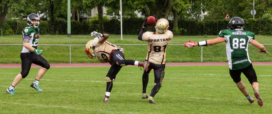 63:0 (7:0 / 28:0 / 21:0 / 7:0) hieß es am Ende auf dem Scoreboard. Die Neu-Ulm Spartans fegten nach dem Gewitter, welches den Kickoff um eine Viertelstunde verzögert hatte, Traunreut Munisier wie ein Tornado vom Platz. Das Publikum traute seinen Augen nicht, die knapp 400, die trotz miserabler Wetterprognose ins Dietrich-Lang-Stadion gefunden hatten, blieben praktisch vollzählig bis zum Abpfiff und feierten mit der Mannschaft. Auch die war euphorisiert, nur Cheftrainer Daniel Koch blieb, wie gewohnt cool, und wusste dieses außergewöhnliche Ergebnis wohl einzuordneten (siehe Interview am Schluss dieses Berichts).