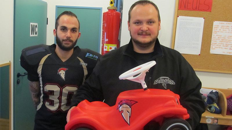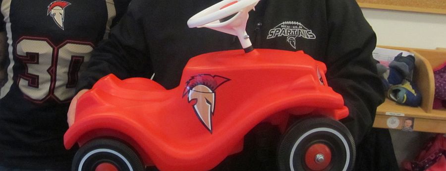 Dabei hat das Bobby Car eine kleine Besonderheit: Die Spartans statteten es mit ihrem Logo aus, so dass die KiTa St. Nikolaus nun das einzige offizielle Spartans-Bobby Car der Welt besitzt.